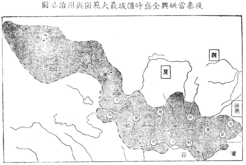 後秦當姚興全盛時之最大疆域範圍與州治略圖