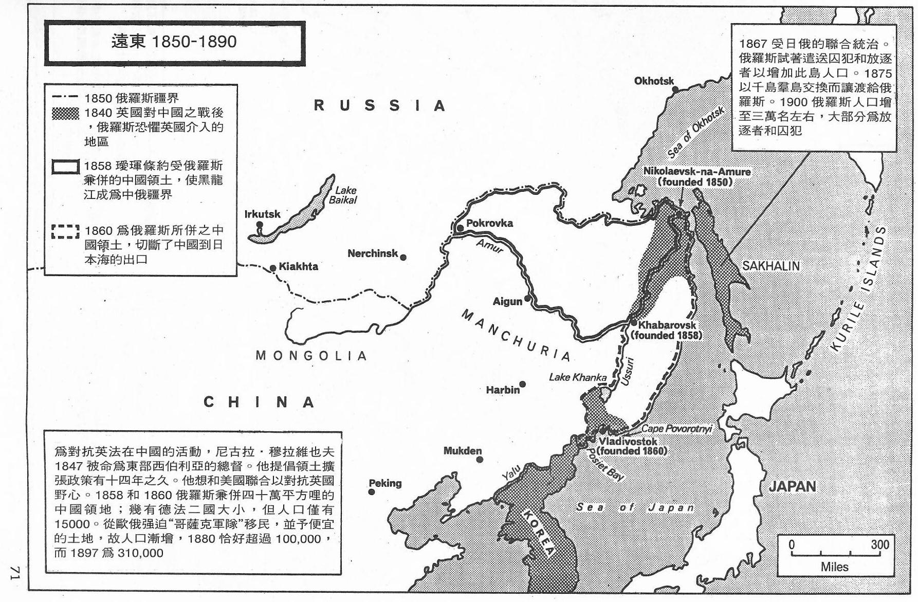 筆者注:1850年為道光29年,1890年為光緒15年;1858年(咸豐8年)璦琿條約;1858-1860年,俄羅斯兼併中國領土40萬平方哩(約104萬平方公里)。