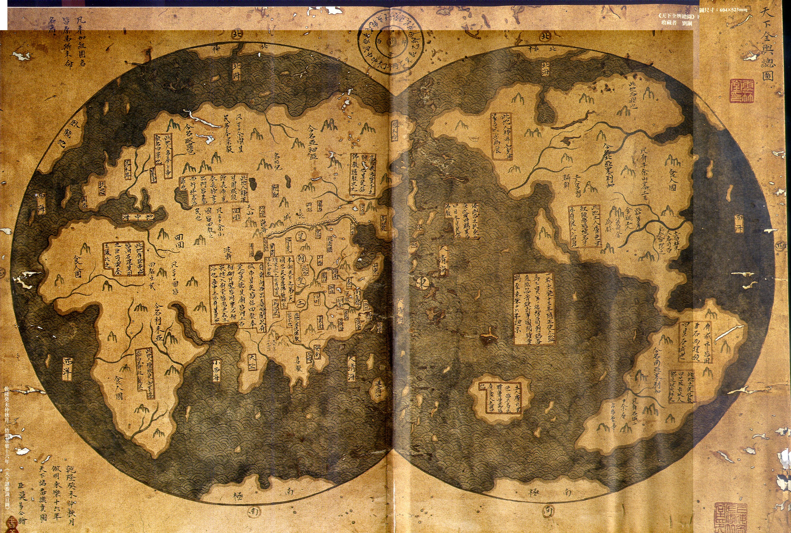 四卷本提到的「采輯圖」的ㄧ種,年代早於所謂哥倫布發現新大陸之1492年;該圖在今北美洲靠近阿拉斯加地帶圈注:「此地人種亦如契丹、蒙古,以魚為食」;在今美國西部注釋:「此地土人膚色黑紅,頭腰皆披鳥羽,亦有食人之習也」;在今南美洲有兩個紅筆圈注:「有城市皆用巨石而建,故曰其石城也」,「此地之民信教曰巴拉卡,以人祭之,以火拜之」;今澳大利亞陸地上圈注:「土人膚亦黑色,皆不著衣,腰墜骨器,皆有食人之習也」;今非洲南部紅框中注釋:「此地人種膚色如黑漆,齒白,唇紅,髮捲」;今亞洲西部則注釋:「自東向西出嘉峪關,凡有城市,其民皆信回教,奉莫哈莫德,其廟皆用土石相嵌,進入廟堂皆需更衣沐浴也,吾中土亦有其民也」;在今亞洲與歐洲交界處有紅框注釋:「此地人種深目、圓眼,頭纏長布,寬衣長褲,女子出門皆裹面而行,違者治罪也」;在今東歐部份則注記:「此地人多奉上帝,教名曰景也」。