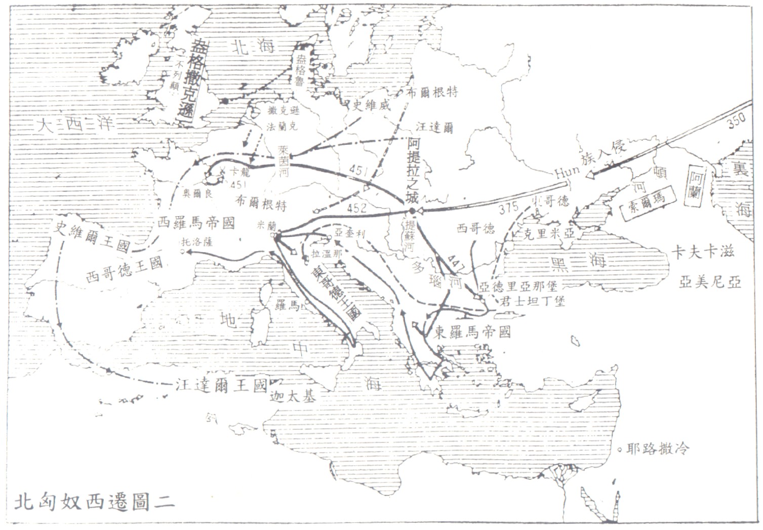 資料來源:劉學銚 ,〈北匈奴西徙與阿提拉帝國〉,《中國邊政》(台北:中國邊政協會,民國100年9月),第187期,頁30, 33, 41。