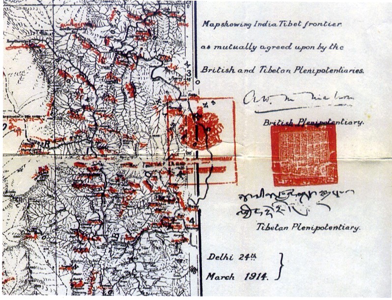 資料來源:跋熱•達瓦才仁暨雪域智庫編纂,《圖片西藏流亡史》(台北:雪域出版社,民國100年3月初版),頁16。 說明:1914年,中、英、藏三方全權代表在印度西姆拉談判,中方對西藏邊界發生疑義,國民政府拒絕簽署正式文本,而由英藏單獨簽約。