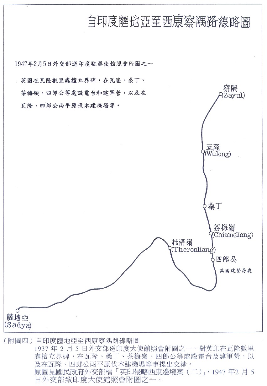 說明:在本文集頁262馮明珠撰寫〈國民政府外交部對英印侵入康藏境域之因應(1943-1947)〉的文章提到:1947年2月5日外交部致大使館照會中所有兩幅地圖,一為「自印度薩地亞至西康察隅路線略圖」 (圖四)此圖仍是西康省所繪「巴安至奪然工(薩地亞)路線略圖」(圖三)之簡圖,用以顯示英印侵略路線及英印立界碑、設電台、建軍營及闢建機場等處;一為「西康省與印度交界圖」 (圖五) ,顯示西康省與印度交界線,抗議英國侵入西康境 域之察隅、科麥等處。