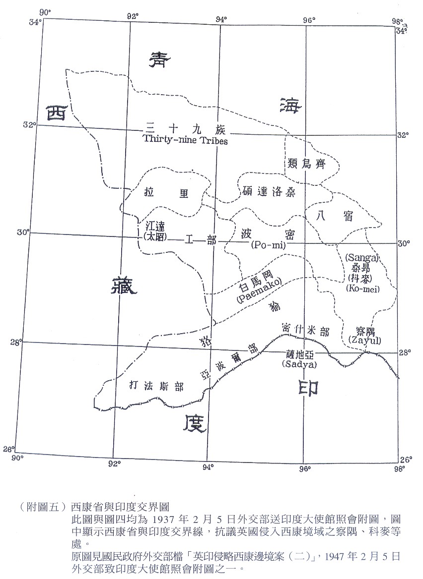 說明:在本文集頁262馮明珠撰寫〈國民政府外交部對英印侵入康藏境域之因應(1943-1947)〉的文章提到:1947年2月5日外交部致大使館照會中所有兩幅地圖,一為「自印度薩地亞至西康察隅路線略圖」 (圖四)此圖仍是西康省所繪「巴安至奪然工(薩地亞)路線略圖」(圖三)之簡圖,用以顯示英印侵略路線及英印立界碑、設電台、建軍營及闢建機場等處;一為「西康省與印度交界圖」 (圖五) ,顯示西康省與印度交界線,抗議英國侵入西康境 域之察隅、科麥等處。
